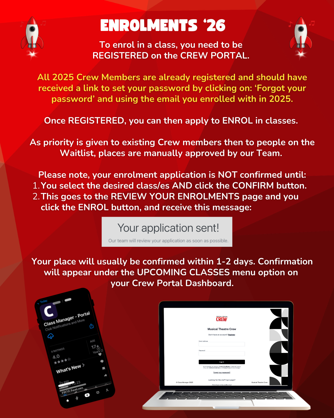 Whether re-enrolling or enrolling for the first time, these Terms and Conditions help ensure everyone involved in Crew understands the commitment and mutual obligation of being involved in our wonderful performing arts community.